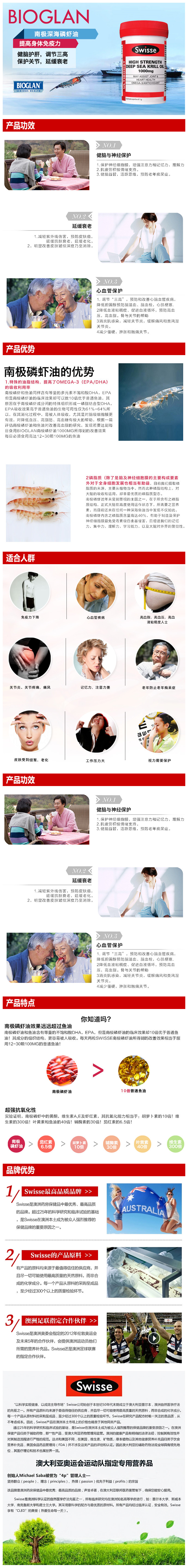 Swisse Ultiboost南极深海磷虾油的优质成分对心脏以及骨关节有极好的帮助。其成分中的虾青素,是一种天然的效果极好的抗氧化物,能帮助减少太阳紫外线对人体的伤害。
