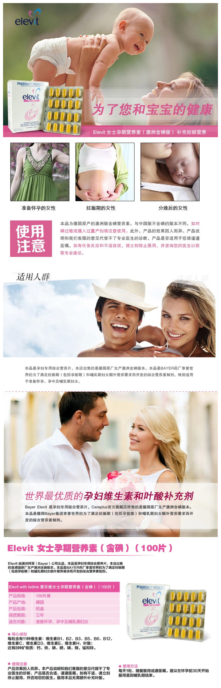 准备怀孕的妈妈们,怀孕中的你,以及哺乳期的你,应该知道Elevit可以大大得减少出生胎儿的缺陷几率。Elevit孕妇每日一次服用的,补充维他命和矿物质产品。经证明,更重要的是它可减少胎儿神经中枢受损,包括脊柱裂。与其他孕妇配方不同,此产品已经被超过一百万成功怀孕案例证明它的效果。食用健康的饮食,Elevit内含妈妈必须的多重维他命及矿物质.含比其他配方含更多的叶酸,帮助防止缺铁。