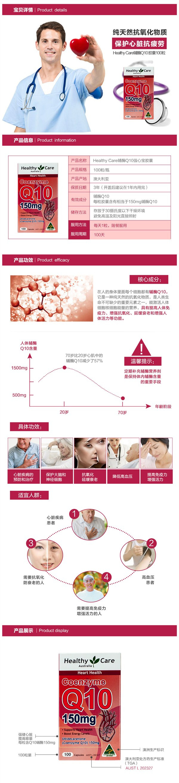 - 型 号: 澳洲直邮 Healthy Care CO Q10 辅酶胶囊150mg 100粒 心脏保健品